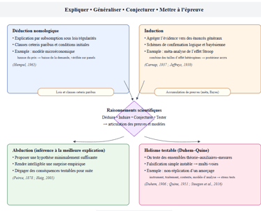 La déduction nomologique vise l’explication par subsomption sous des lois ou régularités conditionnelles (📁 Hempel, 1965). Exemple : un modèle micro-économique déduit une baisse de demande après hausse de prix, toutes choses égales, et vérifie la dérivation sur données de panel.