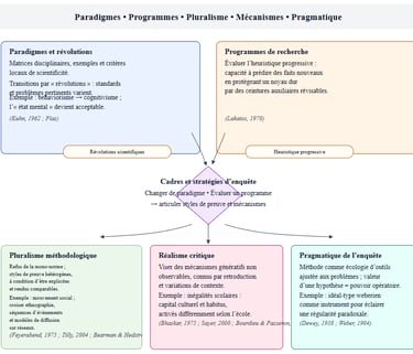 Les paradigmes articulent matrices disciplinaires, exemples et critères locaux de scientificité ; les transitions se font par « révolutions » où varient standards et problèmes pertinents (📚Kuhn, 1962). Exemple : le passage du behaviorisme au cognitivisme redéfinit l’acceptable : l’« état mental » cesse d’être tabou expérimental. (📰Régine Plas)